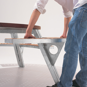Sur un piètement et une structure en acier galvanisé, plateau et assises sont en iroko un bois résistant et d'une excellente stabilité aux intempéries. Il est issu de forêts gérées durablement.
