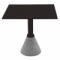 Un fin plateau en laminé compact noir vient contraster avec la silhouette compacte de la base. Il est placé sur une colonne en aluminium noir.